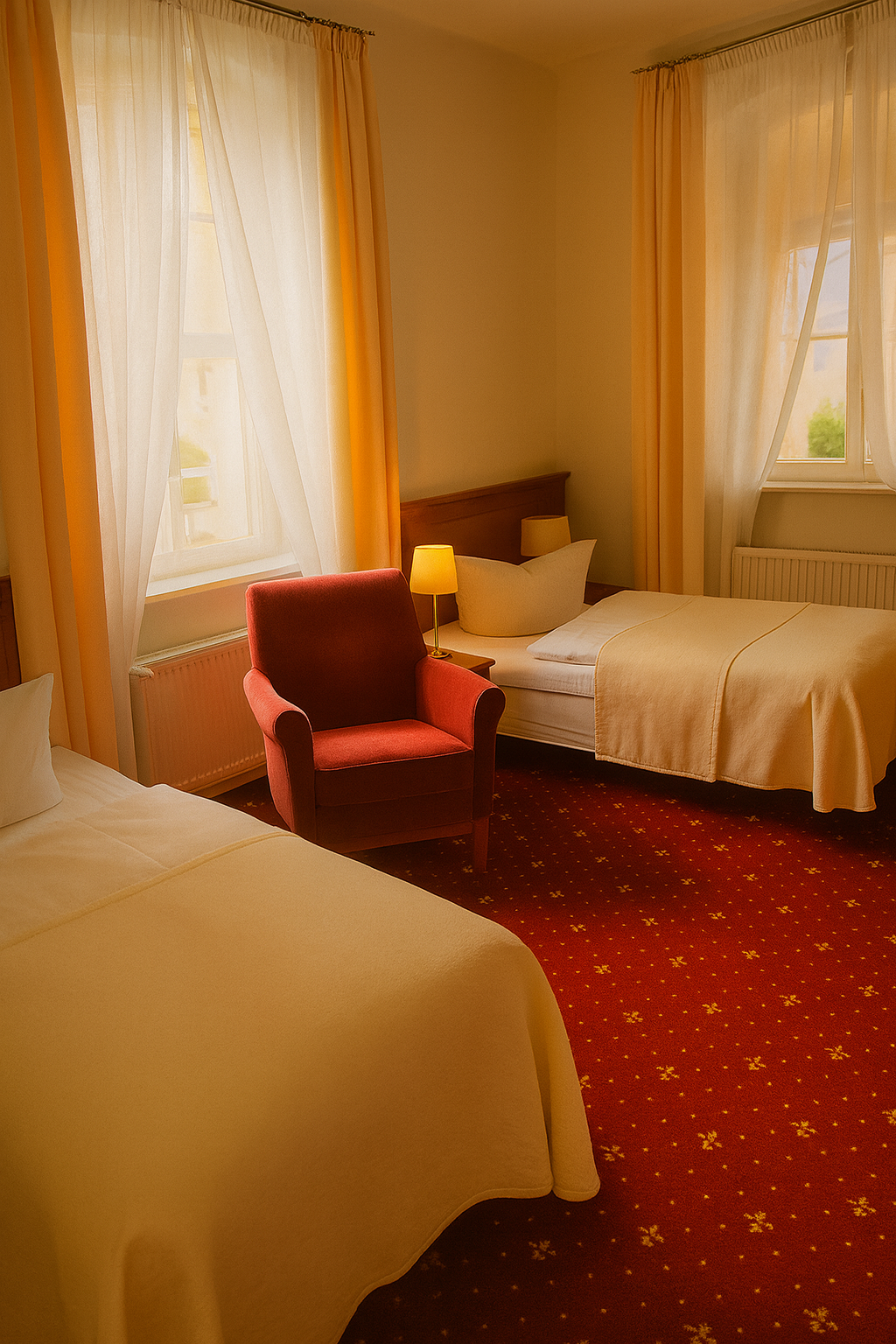 Unsere Doppel-Komfortzimmer sind ausgestattet mit einem Doppelbett, Badewanne/ Dusche, WC, Föhn, Schreibtisch mit Stuhl, kostenlosem Internetzugang per WLAN.